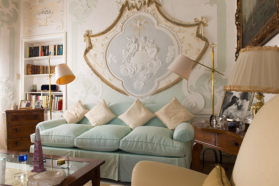 - Salon: ehemals die Gemächer von Kardinal Rubini, mit einem Baldachin mit religiösem Motiv, Kamin und kunstvollem Stuck Stuckarbeiten
