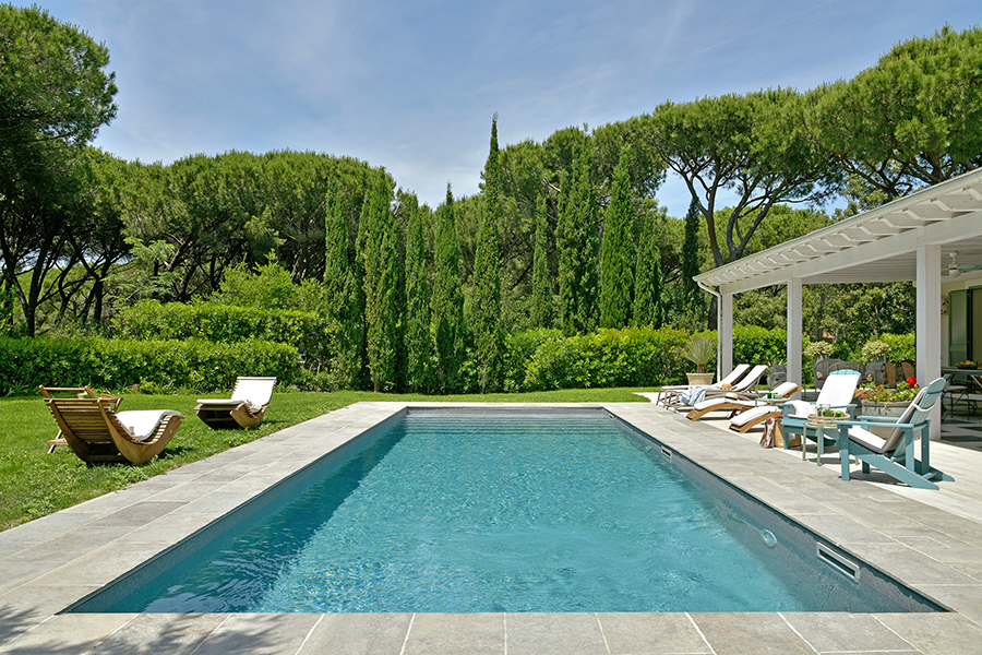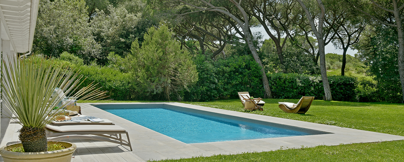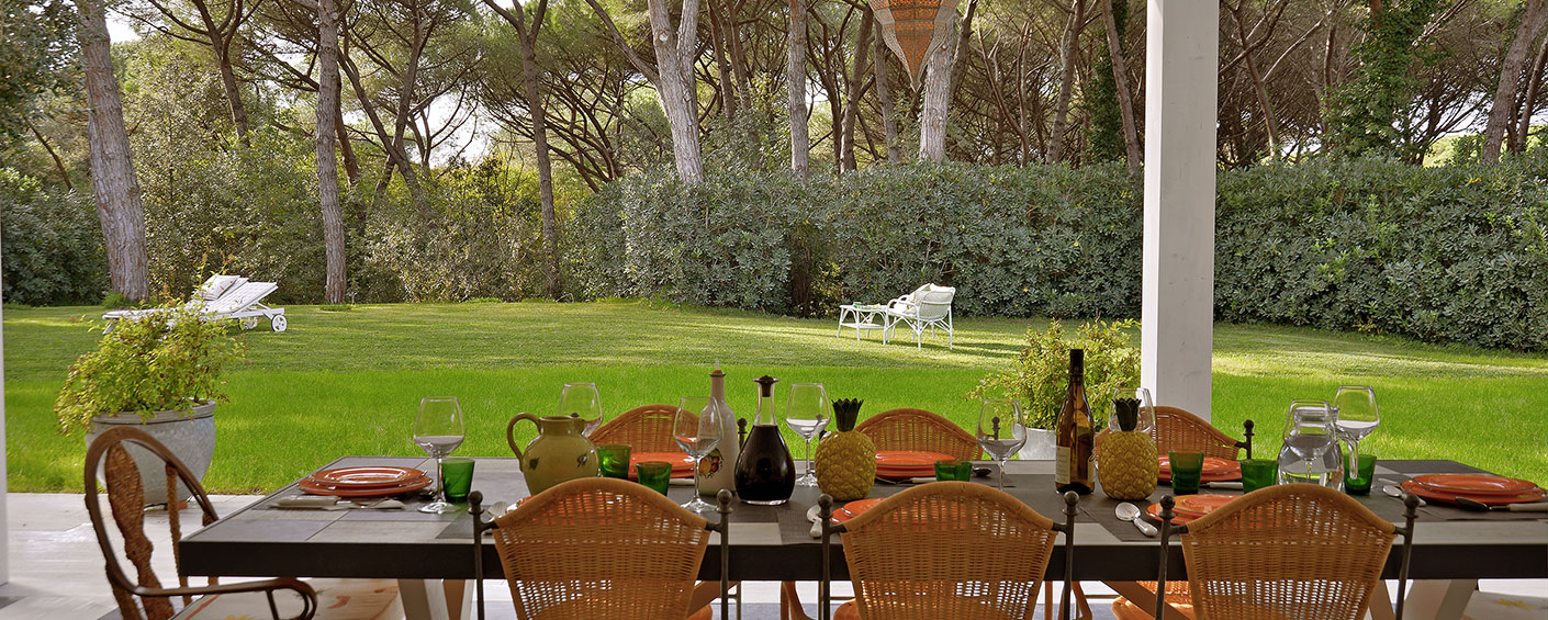Der üppig begrünte Garten bietet sowohl Schatten- als auch Sonnenplätze, die ideal sind, um auf einer Sonnenliege gemütlich zu entspannen oder in einem bequemen Gartenstuhl zu lesen und es gibt einen kleinen Pool. Ein Privatweg durch den Pinienwald führt direkt zu einem unberührten Strand (100 m), an dem für die Gäste des Ferienhauses eine private Strandhütte mit Sonnenschirm und Sonnenliegen zur Verfügung steht.