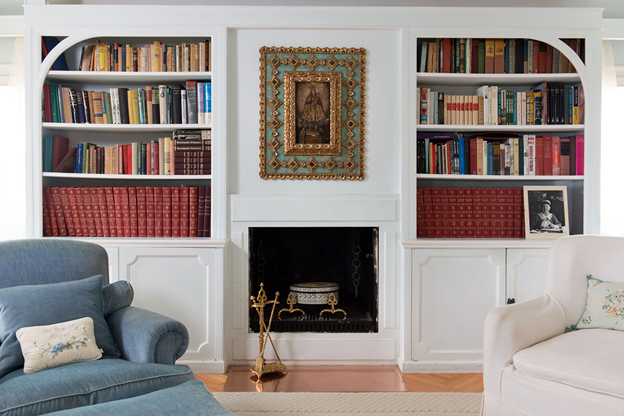 - Gemütliches Wohnzimmer in Pastellrosa und Weiß mit dekorativem Kamin und Stuckpaneel