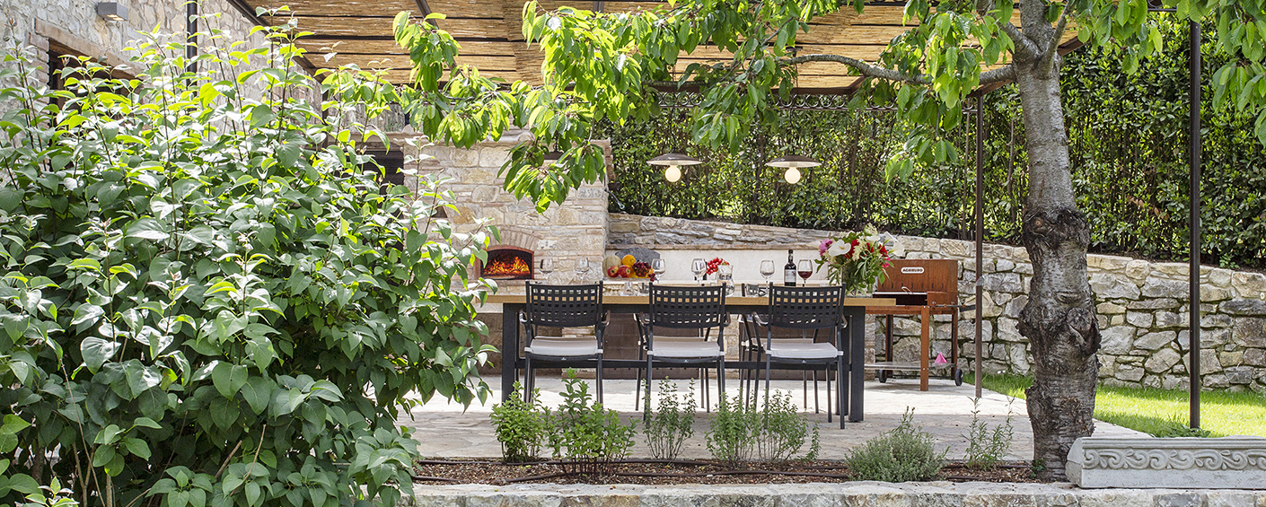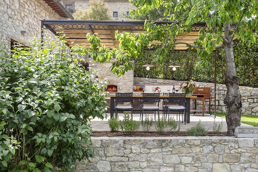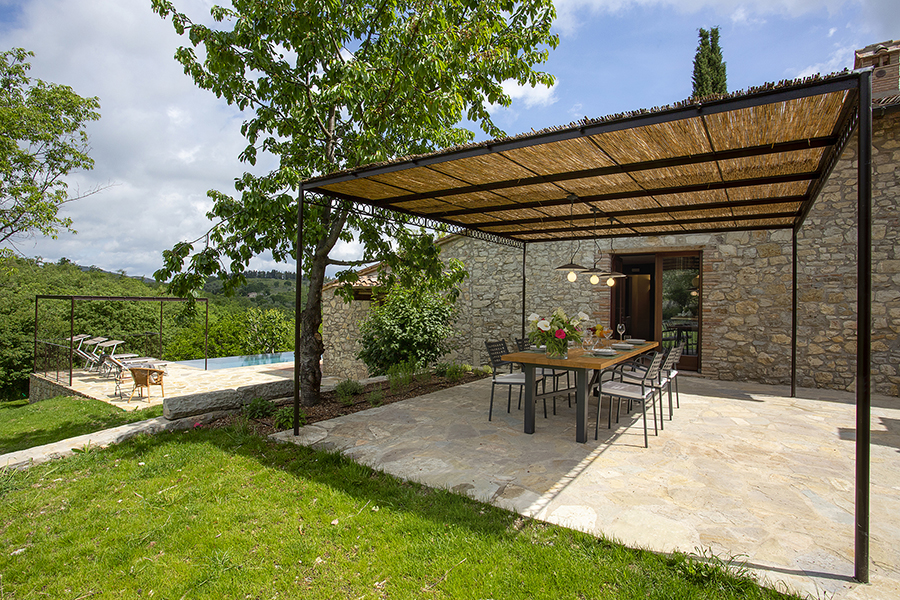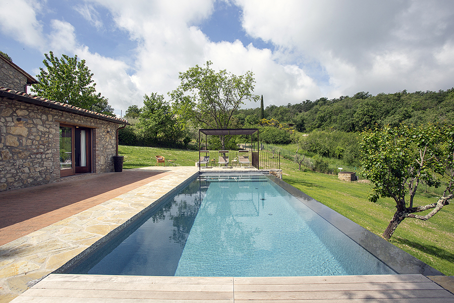 Umgeben ist die Villa von einem etwa 2.500 m² großen Garten. Der Salzwasserpool, auf Wunsch beheizbar, lädt zum Entspannen auf Liegestühlen unter Sonnenschirmen ein – stets begleitet von einem atemberaubenden Blick über die Chianti-Landschaft. In unmittelbarer Nähe sorgen ein Pizzaofen und ein Grill neben der überdachten Pergola für genussvolle Mahlzeiten im Freien und echtes toskanisches Lebensgefühl.
