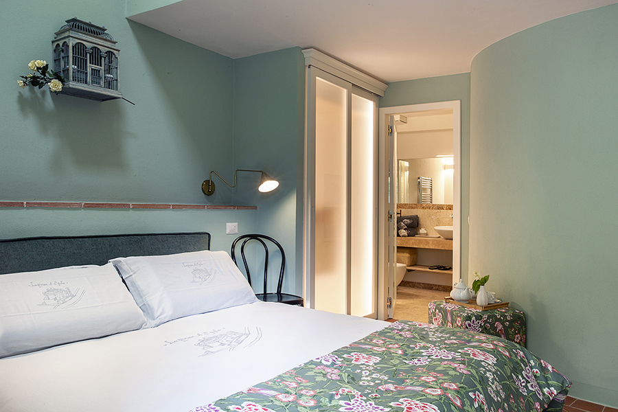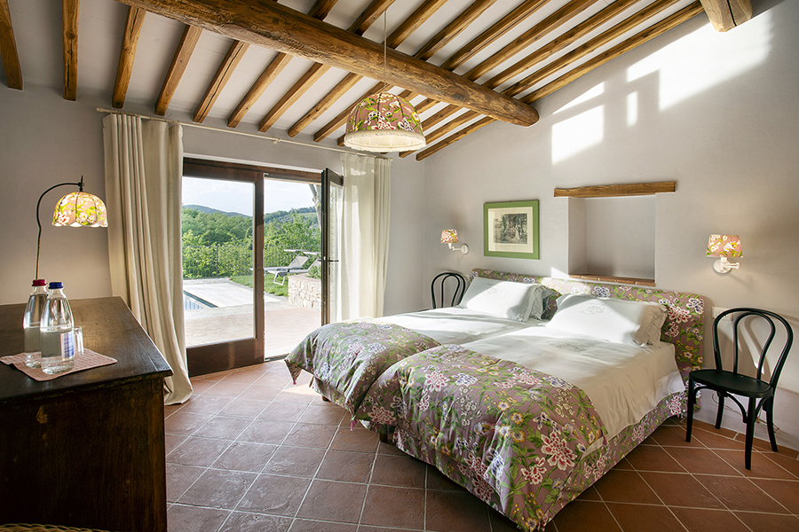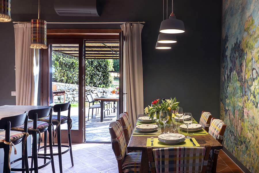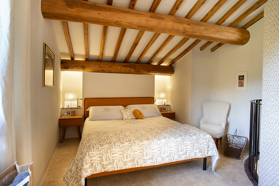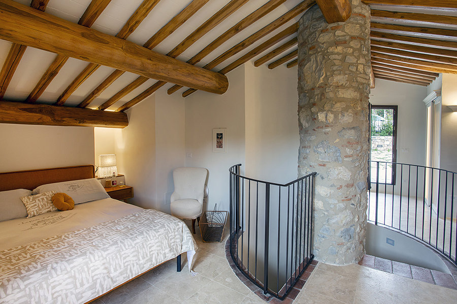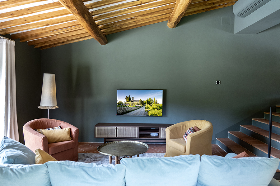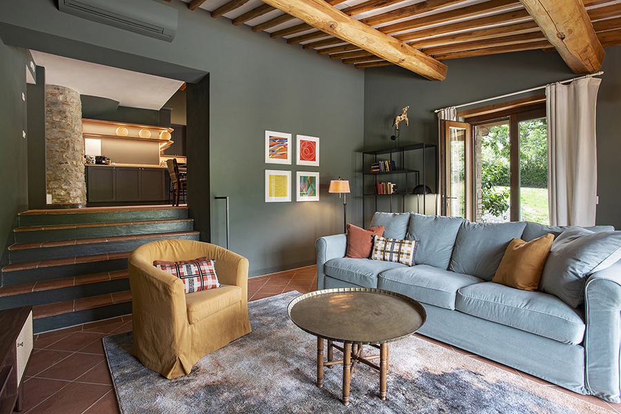 Die Innenräume verbinden klassische toskanische Elemente wie Terrakottaböden und sichtbare Holzbalken mit pastellfarbenen Wänden und eleganten Möbeln. So entsteht eine helle, zeitgemäße Atmosphäre mit authentischem Charme.