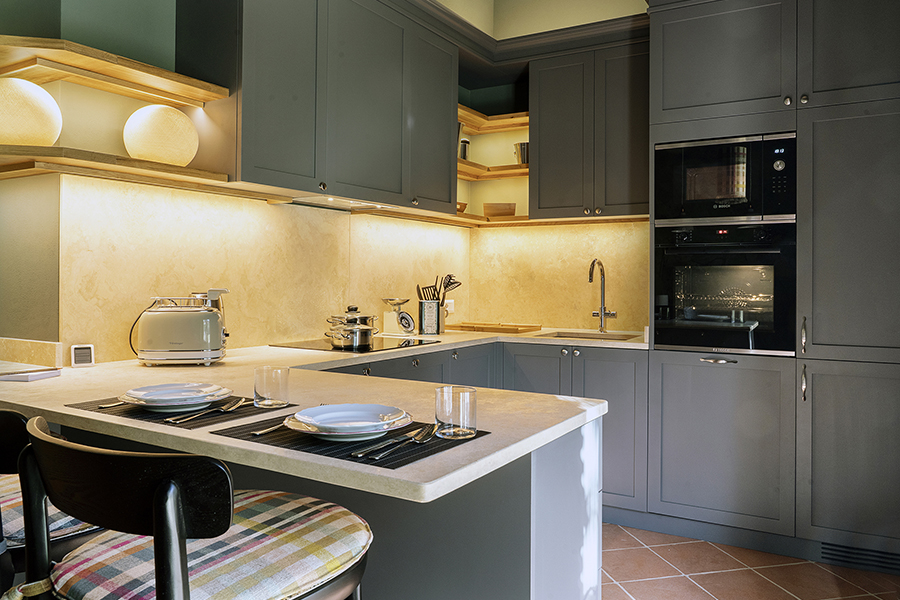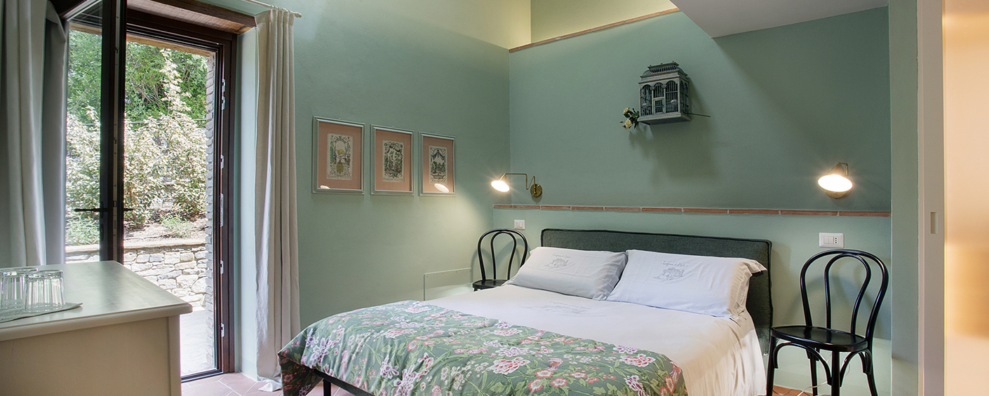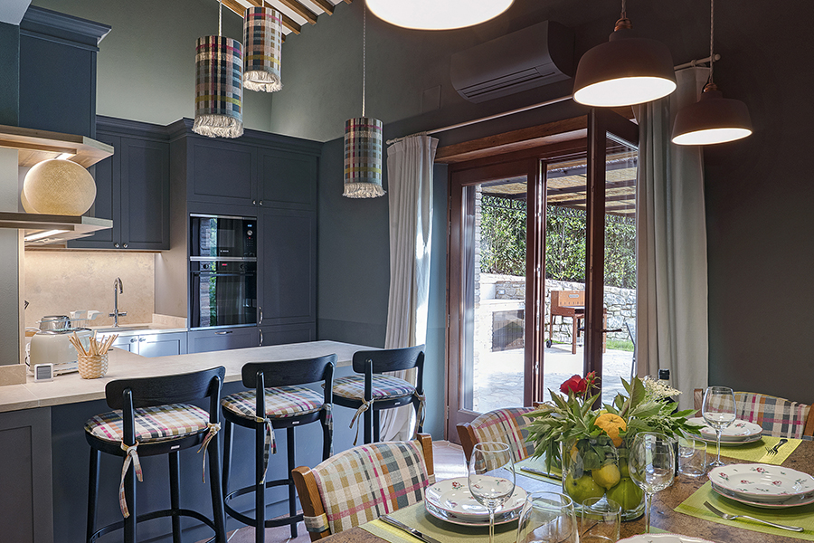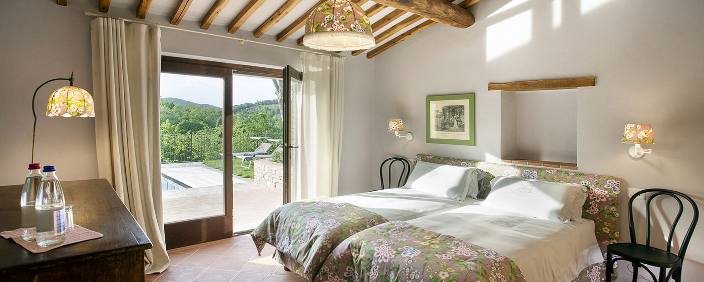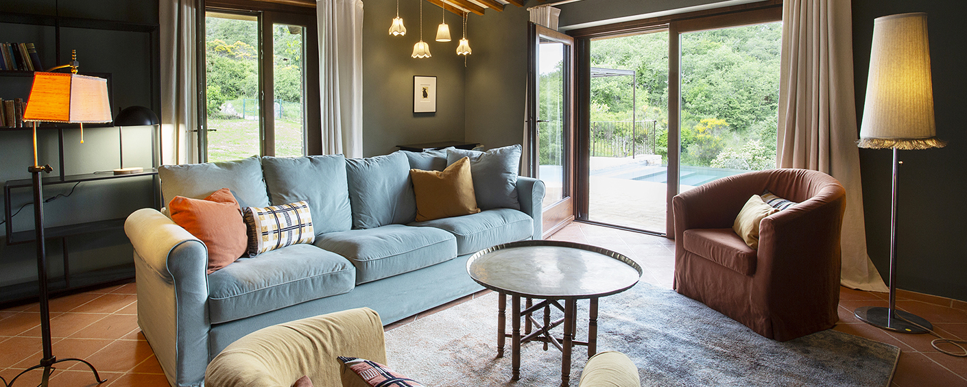 Die Innenräume verbinden klassische toskanische Elemente wie Terrakottaböden und sichtbare Holzbalken mit pastellfarbenen Wänden und eleganten Möbeln. So entsteht eine helle, zeitgemäße Atmosphäre mit authentischem Charme.