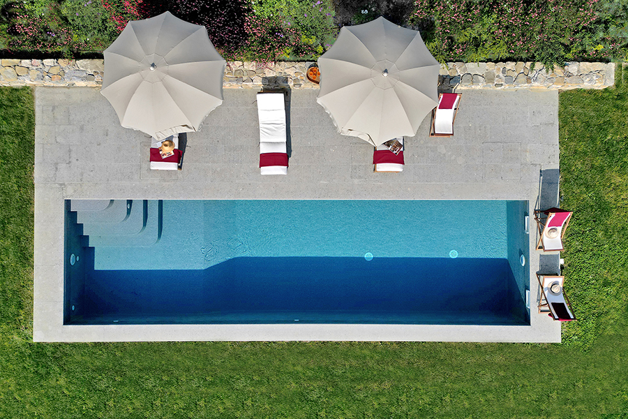 Das Grundstück ist ebenso bezaubernd und verfügt über einen Swimmingpool auf einer unteren Terrasse, der über einen sanften Hang zugänglich ist und durch eine Außendusche ergänzt wird. Eine Terrasse vor der Küche ist für Mahlzeiten im Freien ausgestattet. Gäste können zwischen einem authentischen Pizzaofen aus Stein oder einem modernen Grill wählen.