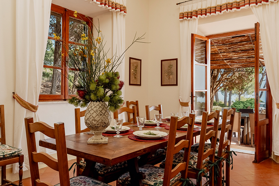 Das Haus gehört zu einer großen Ferienanlage: Etwa 450 Hektar Wald, Weinberge, Obstplantagen und Mittelmeer-Macchia bedecken die Hänge bis zum Meer hinunter, wo private Strände den Gästen dieser Ferienanlage zur Verfügung stehen. Der Küstenstreifen zieht sich 12 km hin, wobei sich kleine Strände und Buchten mit den steilen Felsen abwechseln. Das Feriendorf bietet eine Vielzahl von Aufenthaltsmöglichkeiten: In der Anlage gibt es eine alte Herrschaftsvilla, die geschickt zu einem kleinen Hotel umgebaut wurde, mehrere Wohnungen, die in den Gutshöfen "Fattorien" untergebracht sind, einige Häuser, die sich hier und da in den Pinienwäldern am Meer befinden sowie drei verschiedene freistehende Villen, die hier angeboten sind: Villa Ape, Villa Agave und Villa Eucalipto. Sie liegen an privaten Sträßchen, die zum Meer führen. Im Jahr 2006 wurden sie komplett restauriert, verfügen über einen privaten Pool mit herrlichem Meerblick und sind stilvoll eingerichtet.