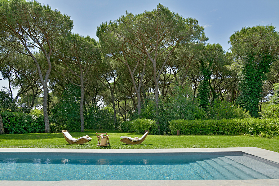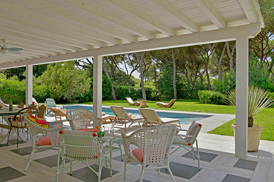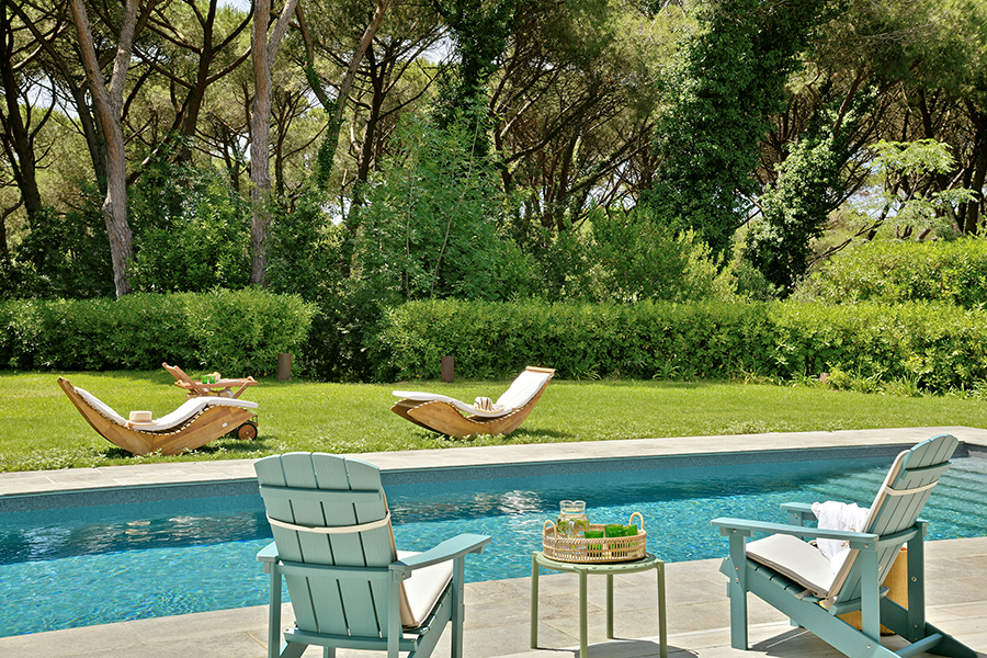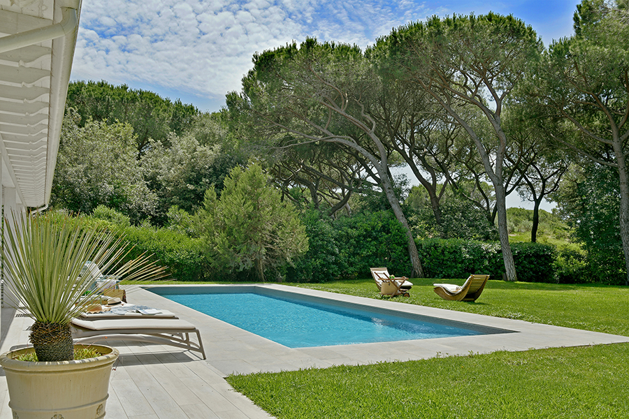 Der üppig begrünte Garten bietet sowohl Schatten- als auch Sonnenplätze, die ideal sind, um auf einer Sonnenliege gemütlich zu entspannen oder in einem bequemen Gartenstuhl zu lesen und es gibt einen kleinen Pool. Ein Privatweg durch den Pinienwald führt direkt zu einem unberührten Strand (100 m), an dem für die Gäste des Ferienhauses eine private Strandhütte mit Sonnenschirm und Sonnenliegen zur Verfügung steht.