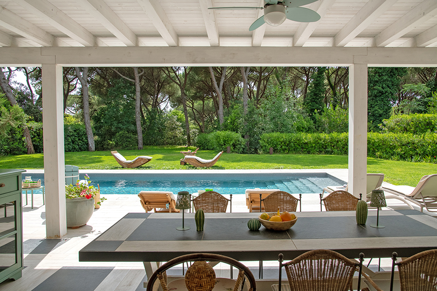 Das attraktive, kürzlich erbaute Ferienhaus ist von einem üppig blühenden Garten mit Rosen, Bougainvilleen, Zypressen und Pinien umgeben und bietet den perfekten Rahmen für einen himmlischen Strandurlaub an einer der schönsten Küsten Italiens.