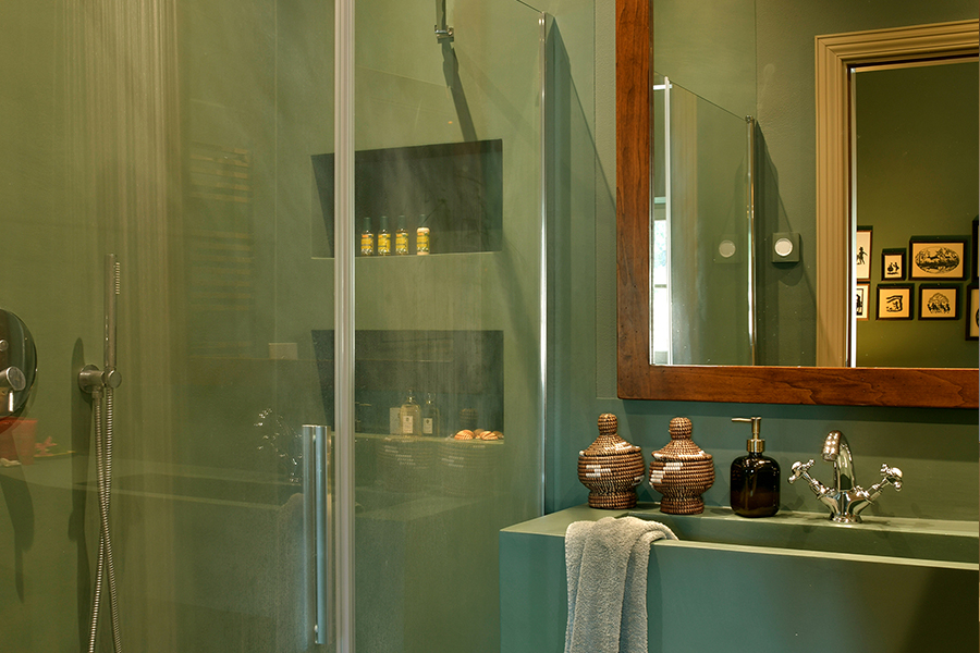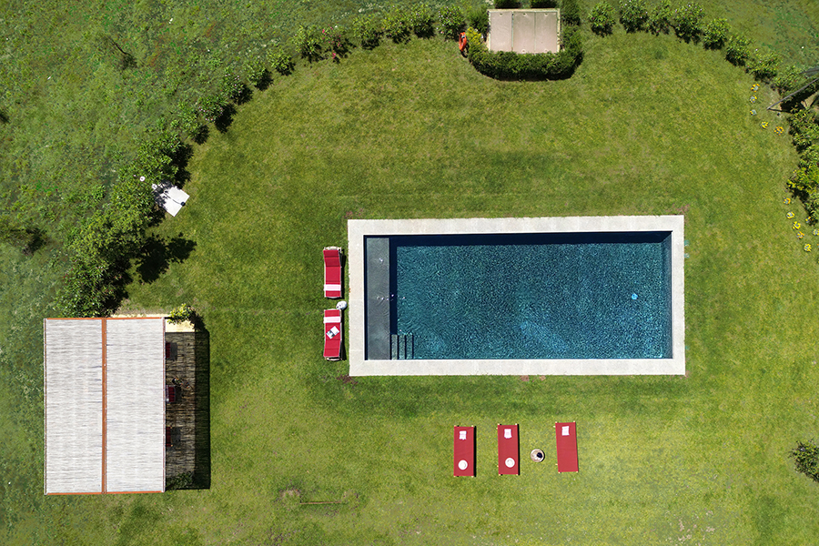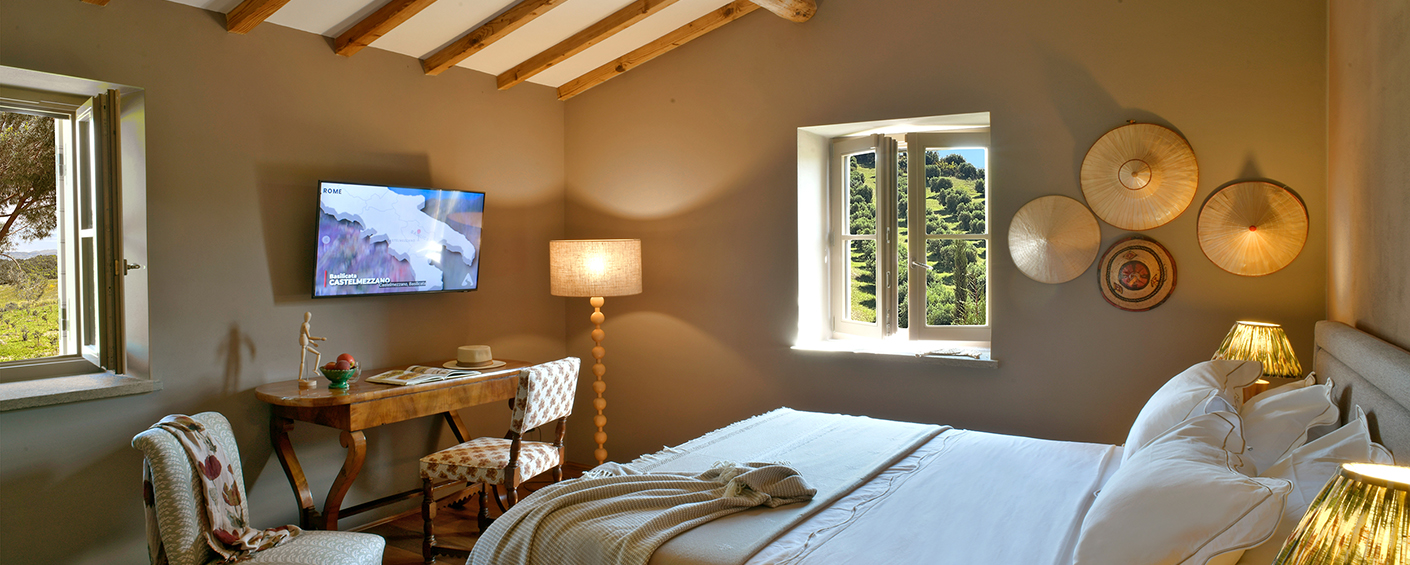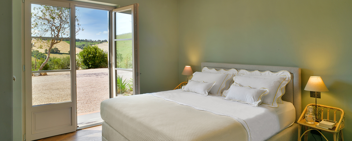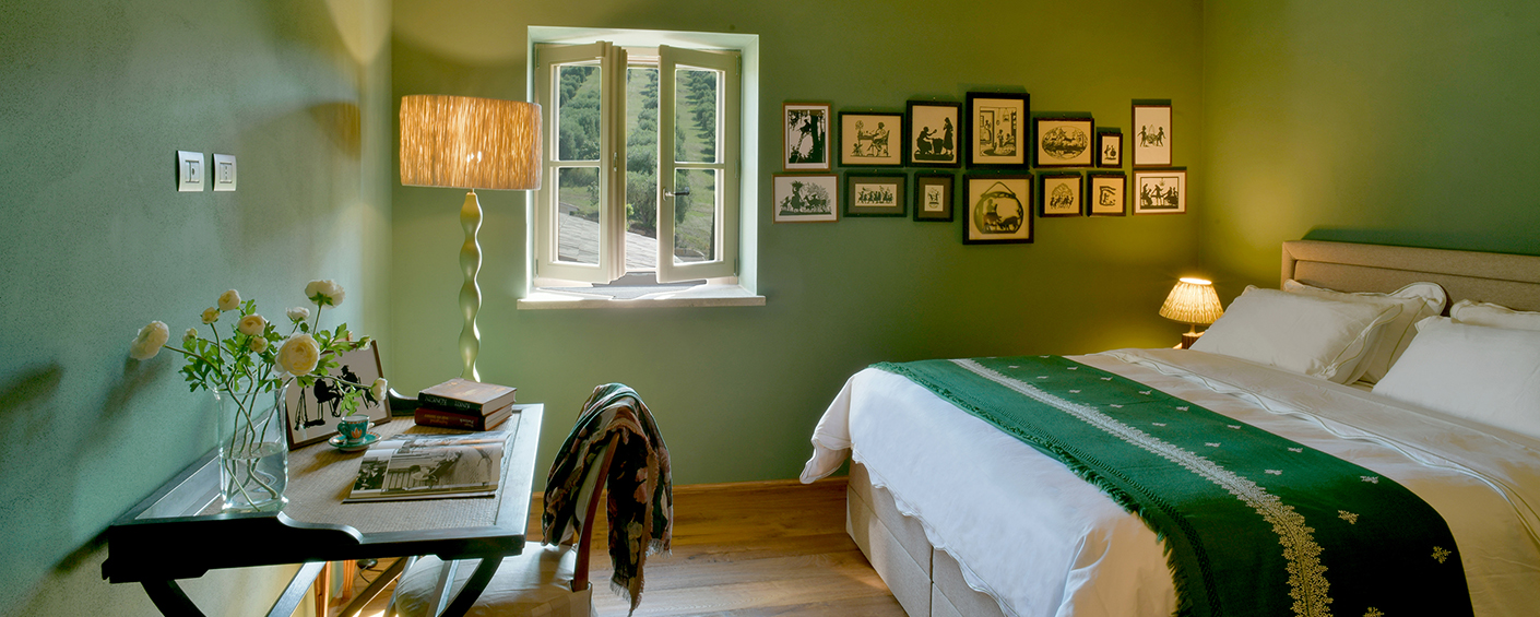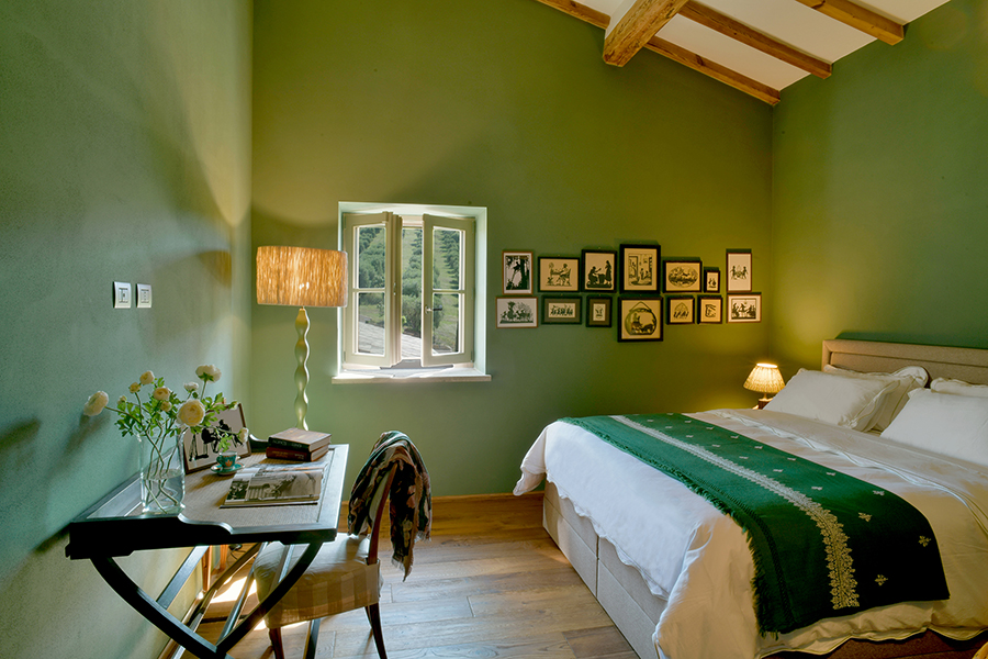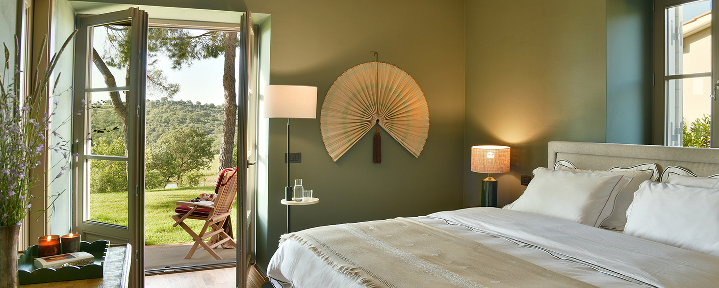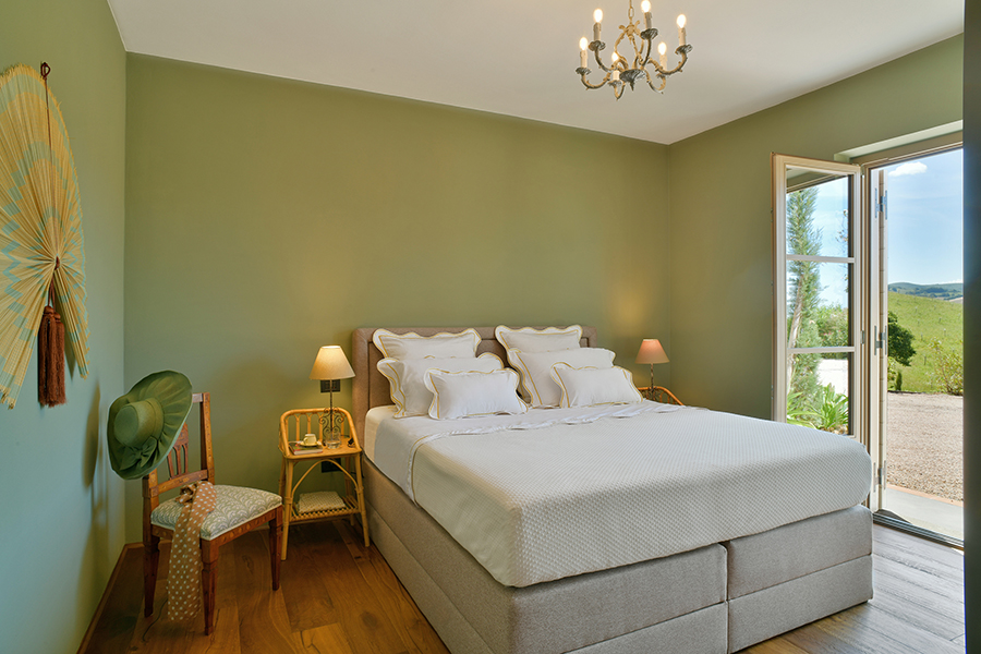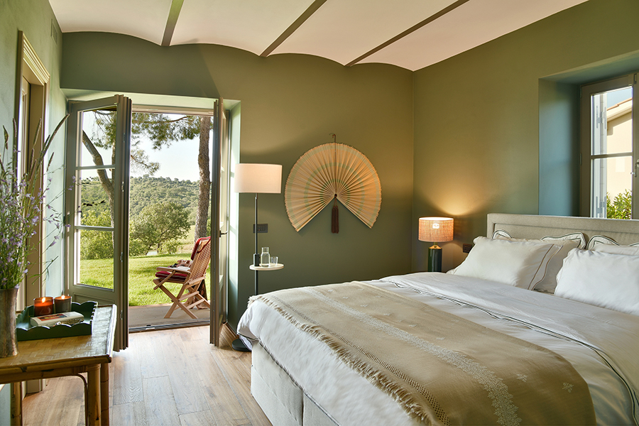 Die Hauptvilla verfügt über drei Schlafzimmer, während das separate Nebengebäude zwei weitere Schlafzimmer bietet. Alle fünf Schlafzimmer haben private Terrassen mit Blick auf die Landschaft. Die Master-Suite besticht durch salbeifarbene Wände, sichtbare Deckenbalken und Flügeltüren, die sich zu einem privaten Außenbereich öffnen.