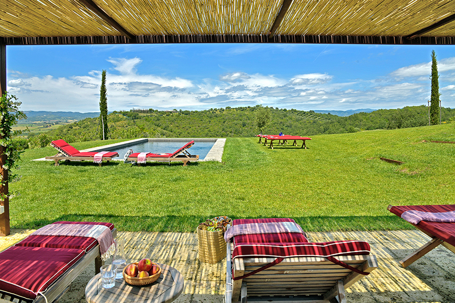 - Swimmingpool mit Blick auf die Hügellandschaft und schattiger Pergola mit Liegestühlen