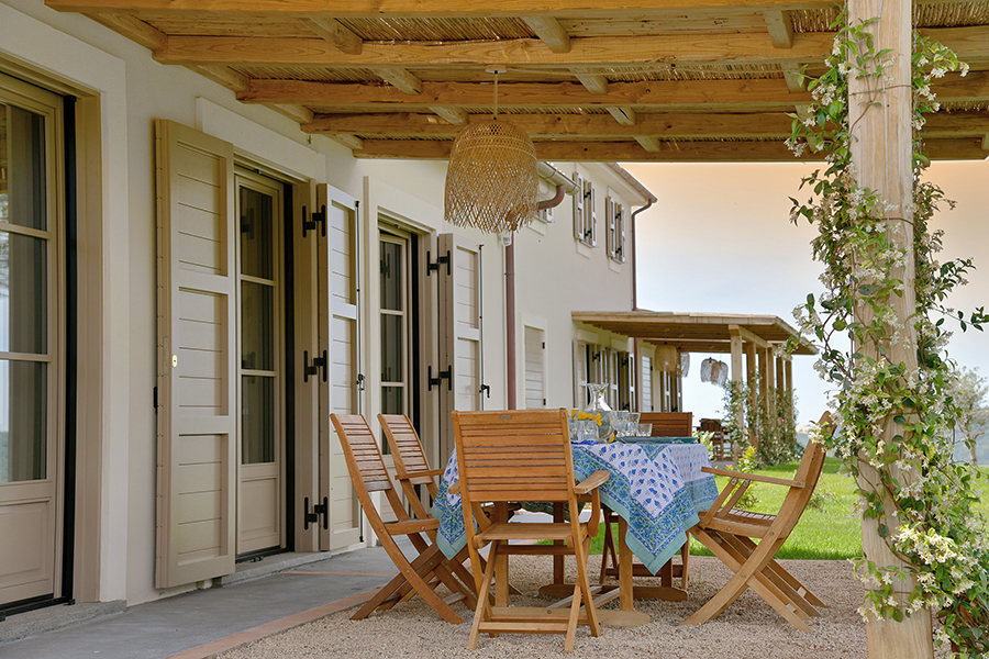 - Großzügige, terrassenförmig angelegte Außenbereiche unter überdachten Pergolen